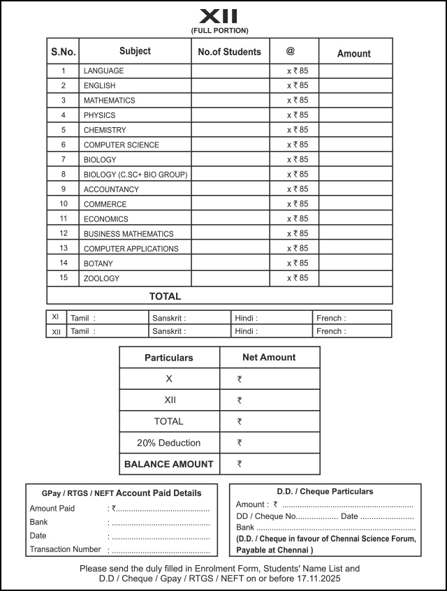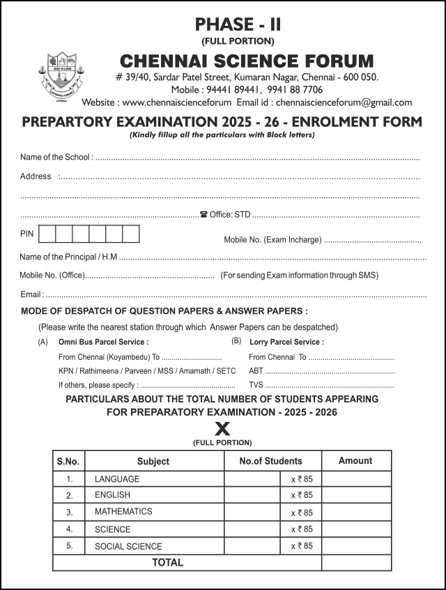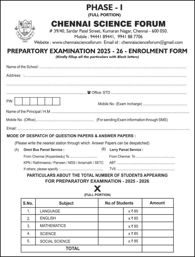 Enrolment Form Available now Please Contact to Administration Office - Mobile: 9444189441, 9941887706, Phone: (044)-2615 6215 - Chennai Science Forum